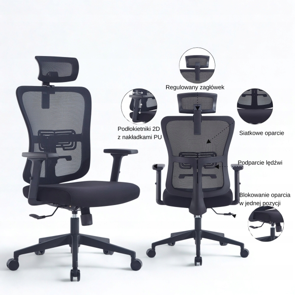 - Siatkowe Oparcie: Wysokiej jakości siatka zapewnia doskonałą przewiewność i komfort, dopasowując się do kształtu Twojego ciała i redukując napięcie.